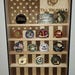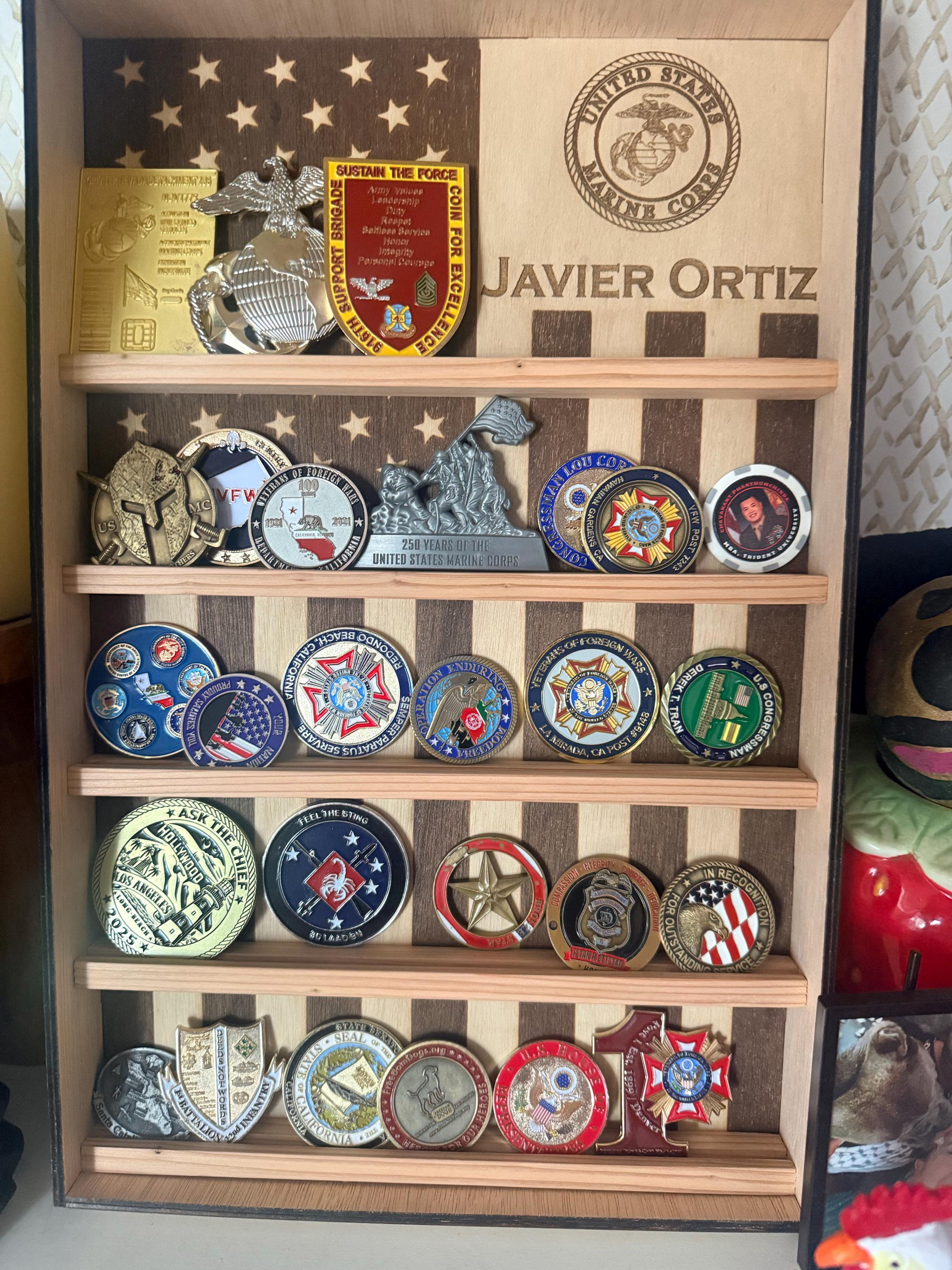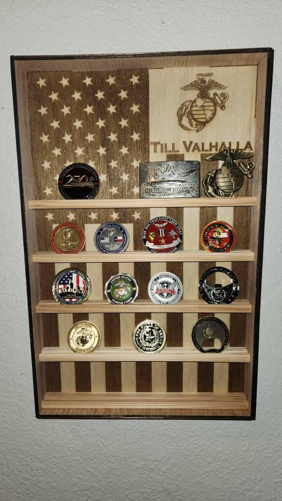 Custom, wooden, wall hanging, engraved military coin holder. Consists of engraved American Flag with custom name, custom logo and 5 shelves for coins. Measures approximately 18in tall x 12in wide x 2in deep. Can hold on average 5 coins per row. The spacing is 2in unless more spacing is requested.