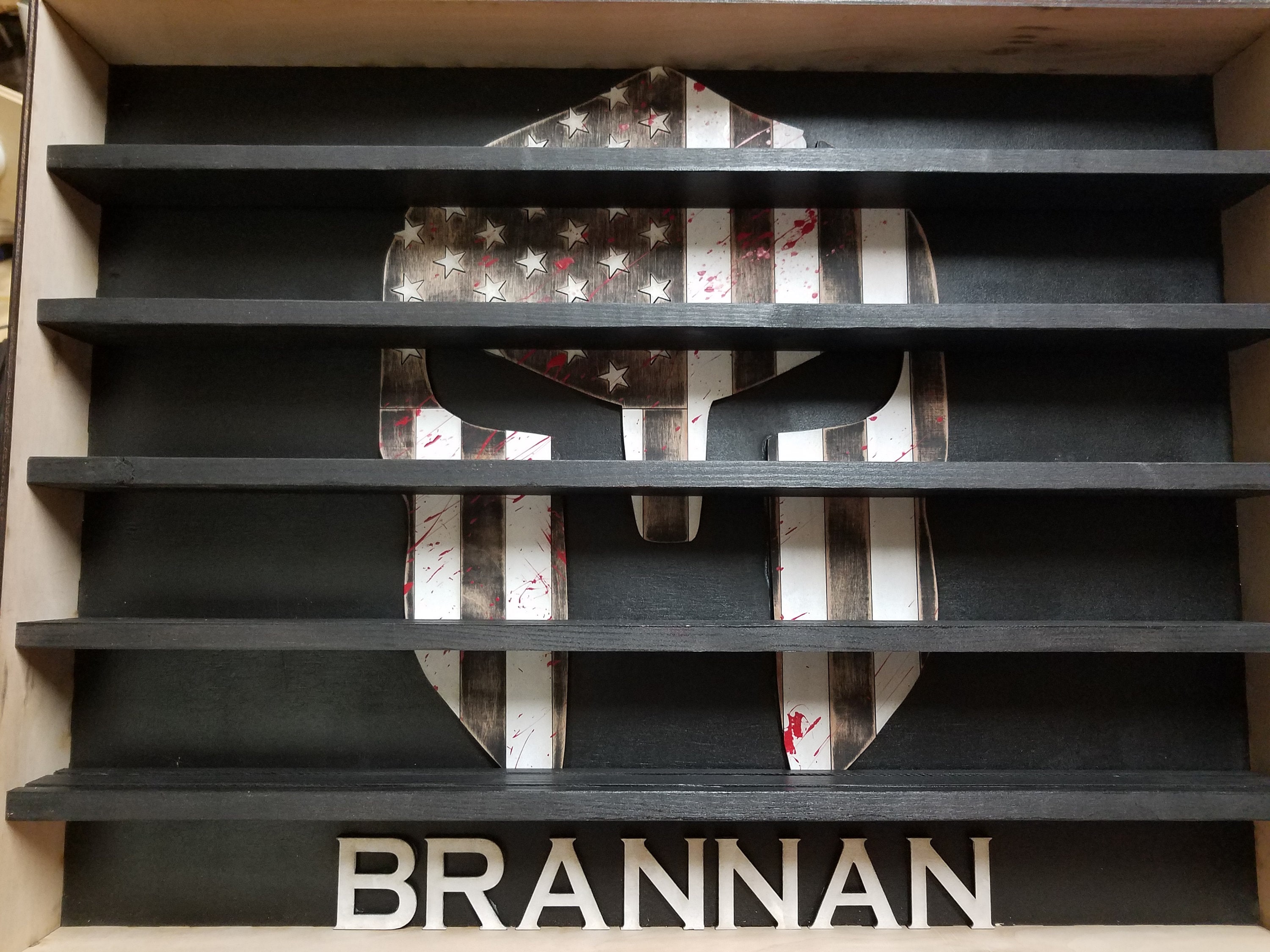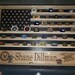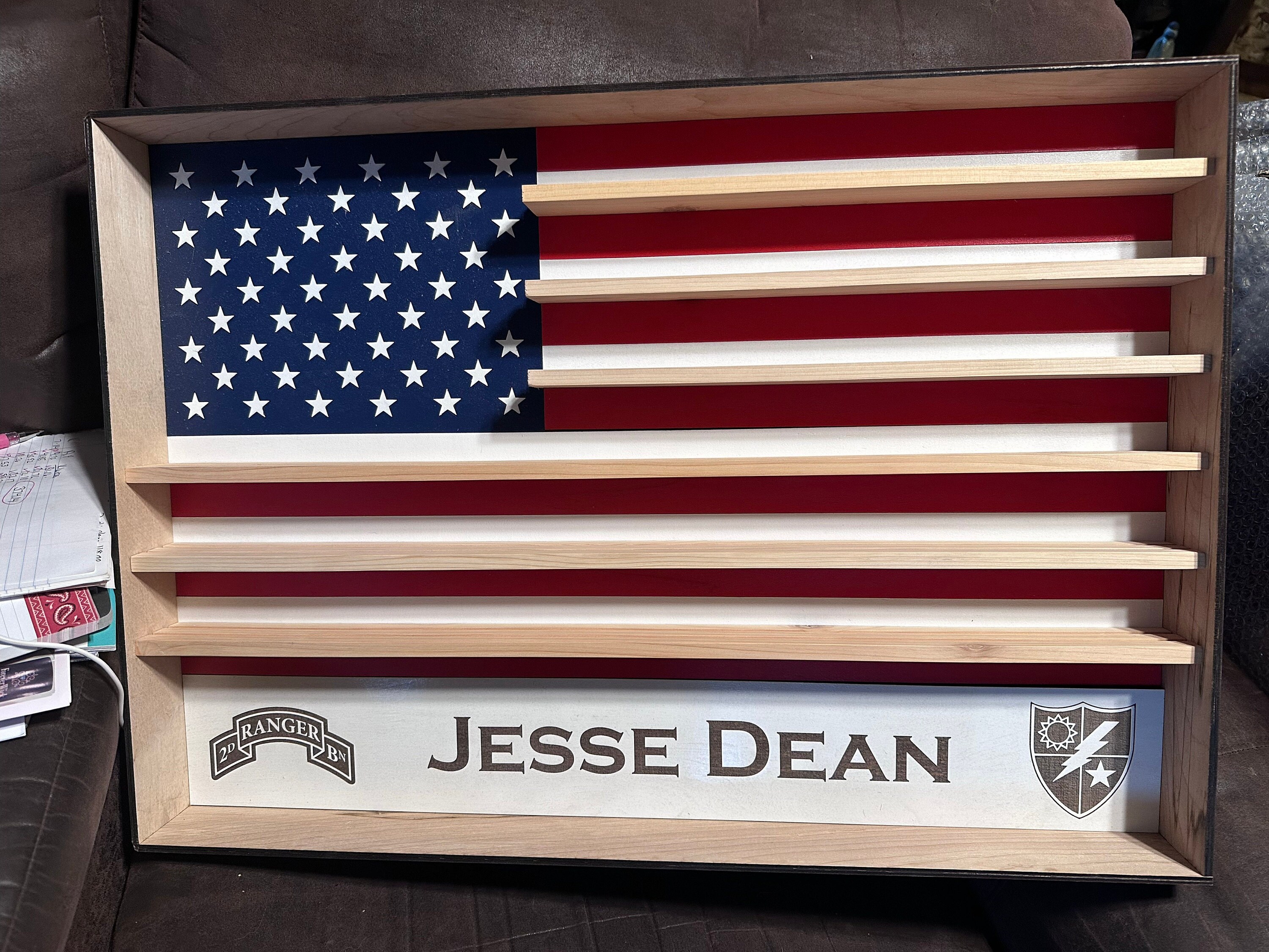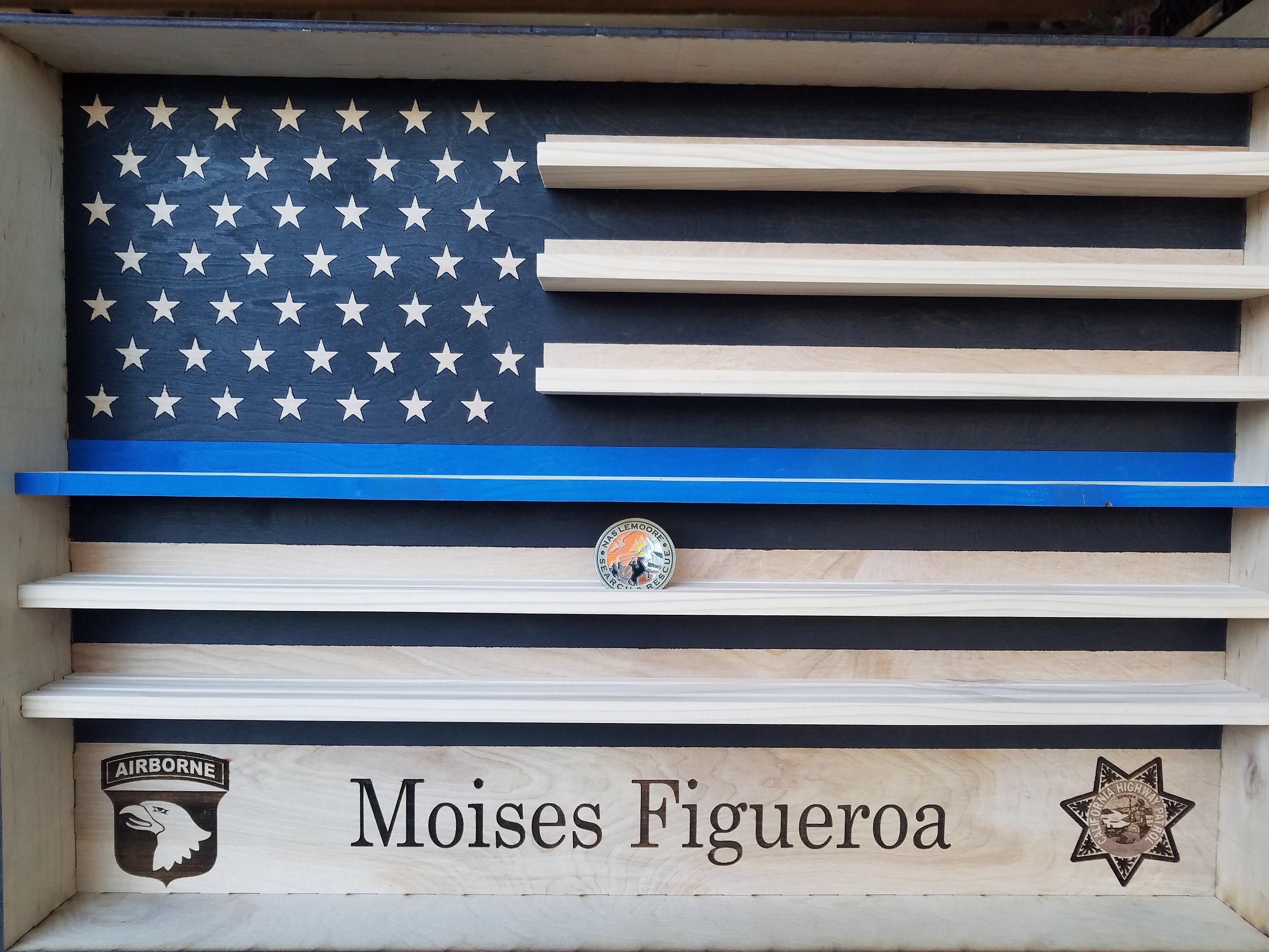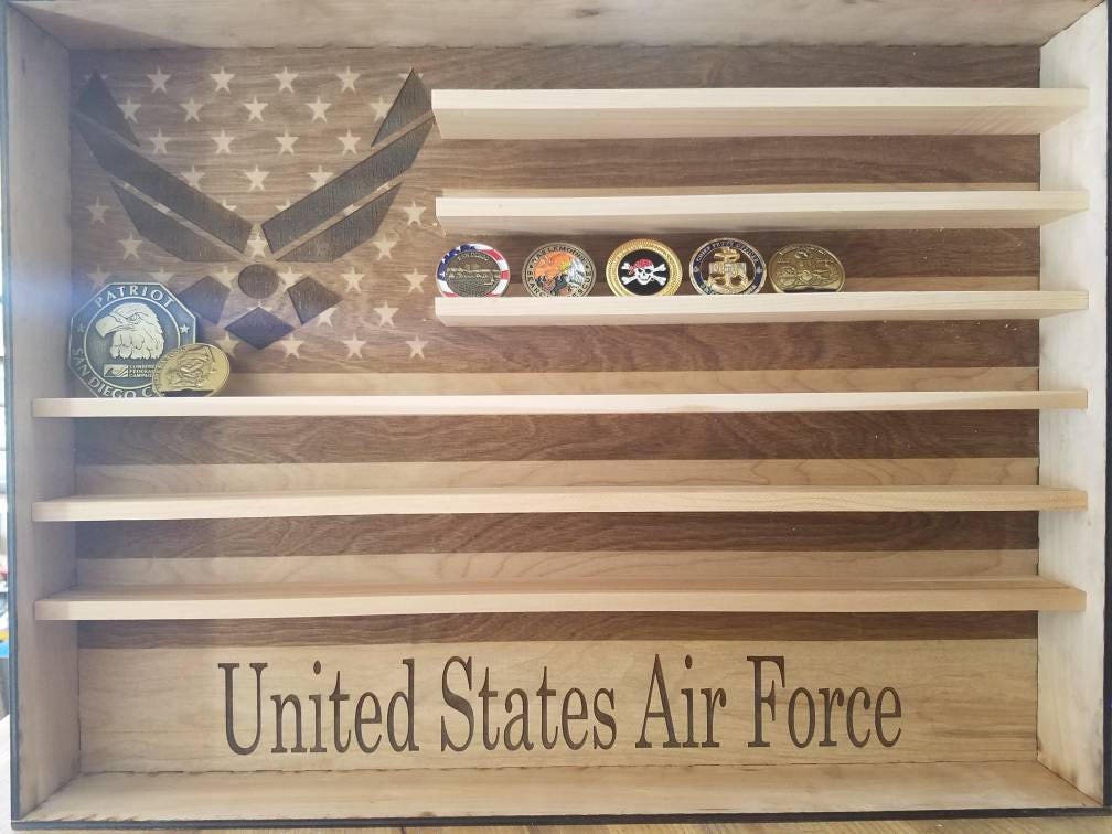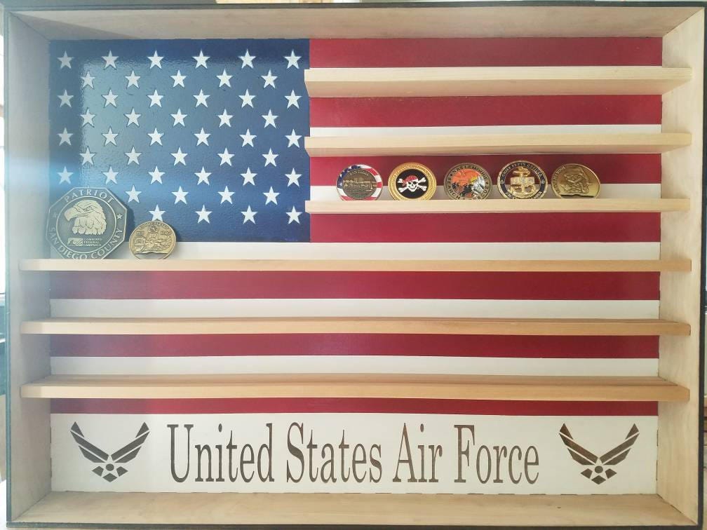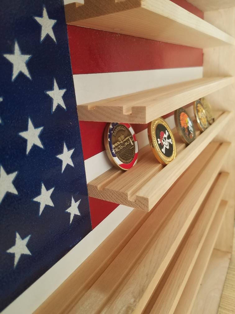 Custom, wooden, wall hanging, engraved military coin holder. Consists of an American Flag with custom name, custom logo and shelves for coins. Measures approximately 18' tall x 24' wide x 3' deep. Can hold on average 24 coins per row for a total of 96 or more.